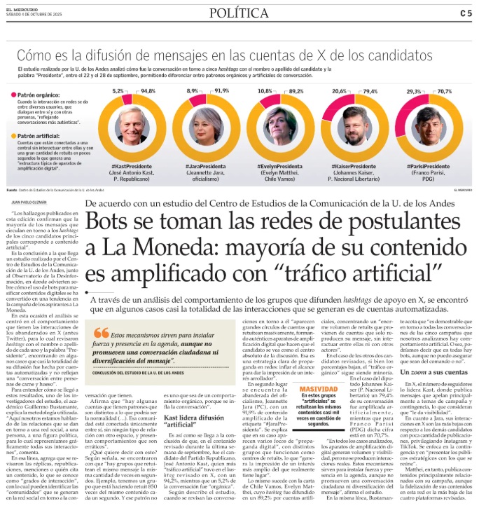 Les compartimos una nota de El Mercurio sobre el informe sobre uso de tráfico artificial por parte de los candidatos a la presidencia que realizamos junto a Guillermo Bustamante-Pavez.  Fecha de publicación: sábado 4 de octubre de 2025.